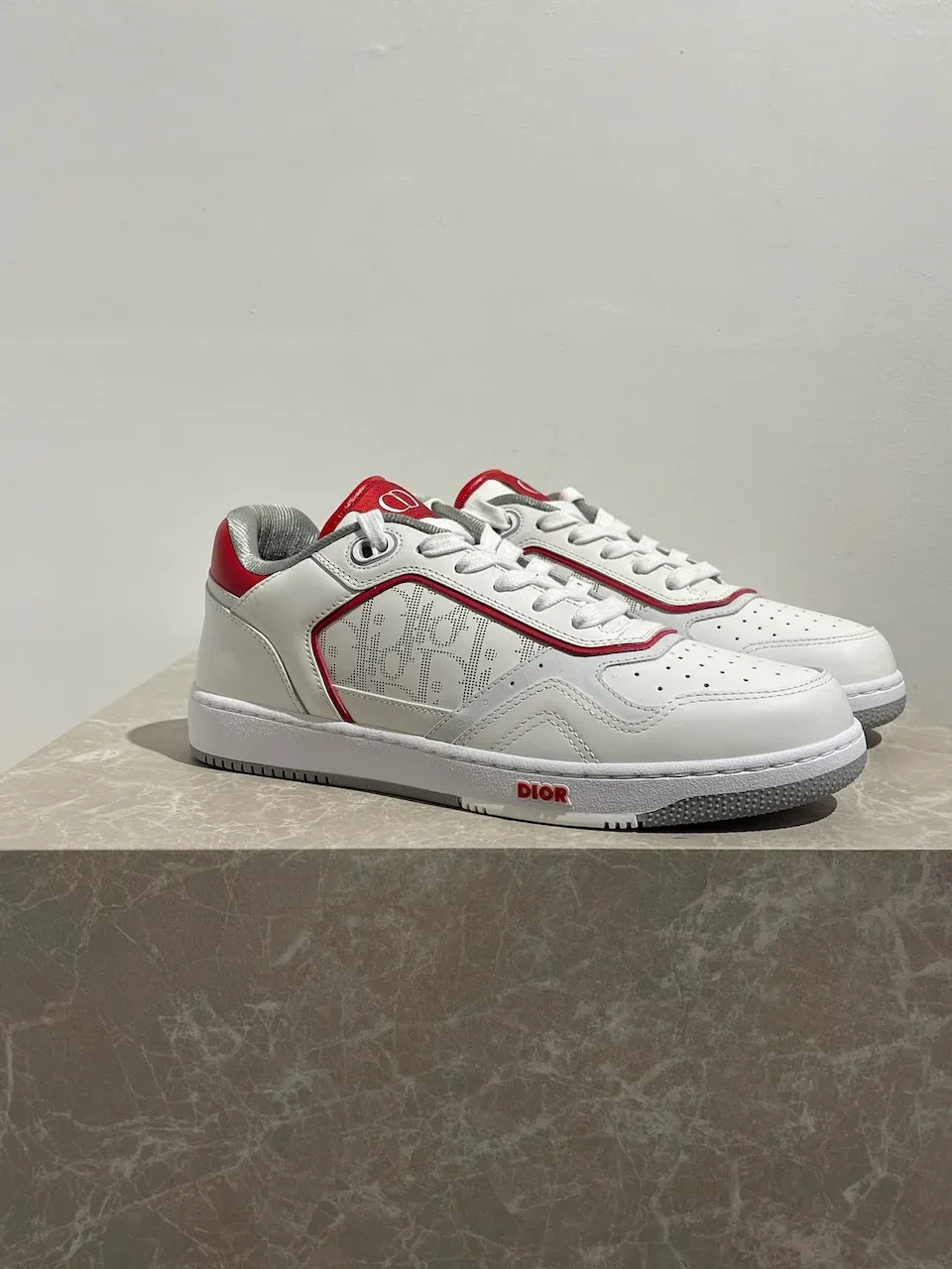 Baskets basses en cuir blanc et rouge à motif Dior Oblique perforé sur les côtés. Fermeture à lacets. Signature Dior à l’arrière, sur la languette et sur le côté.