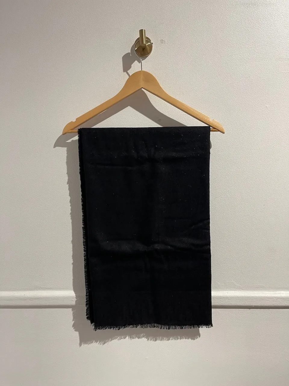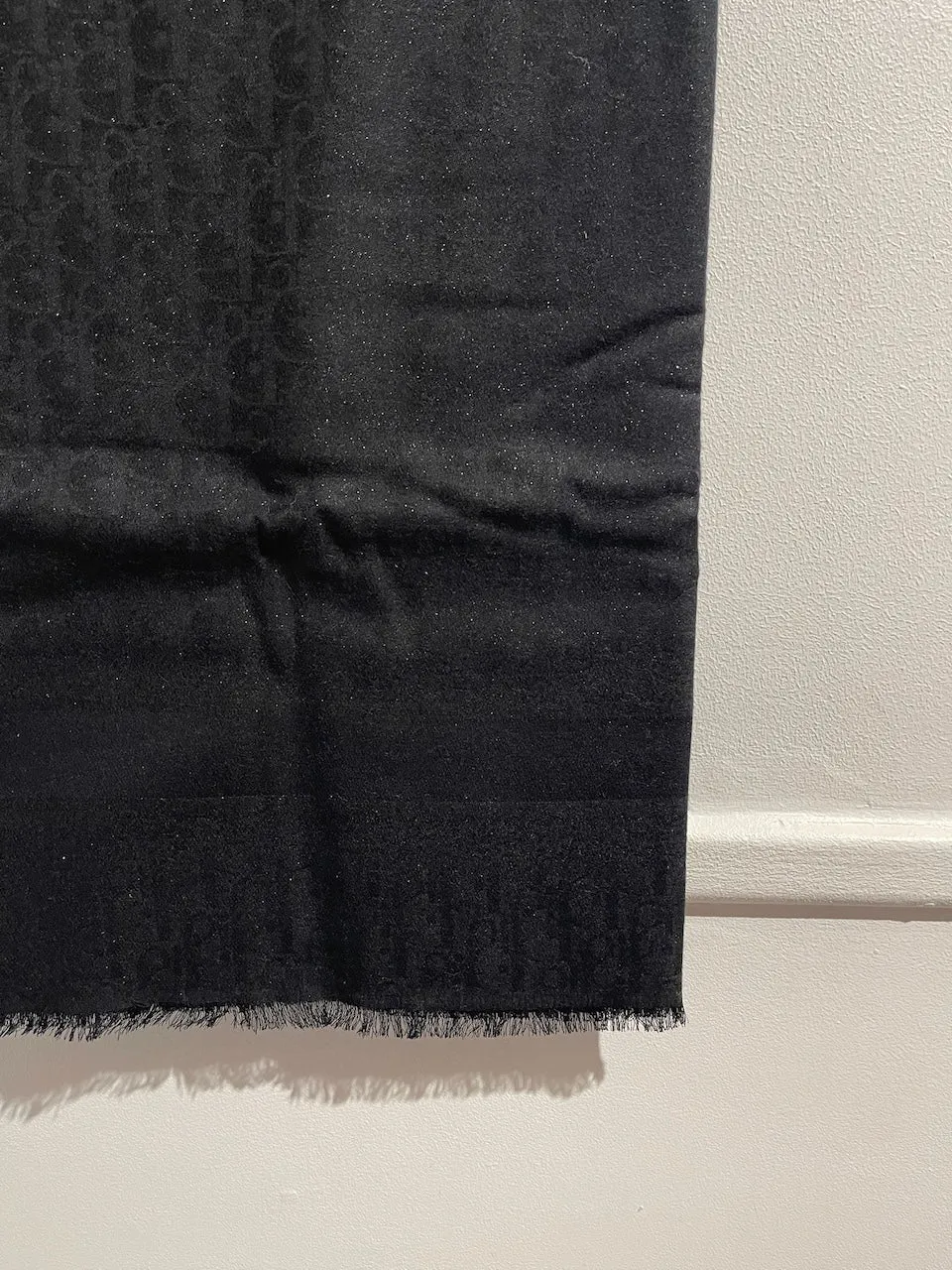 Châle en cachemire et laine mélangé noir à motif Dior oblique ton sur ton et détail pailleté sur l’ensemble de la maille. Signature Christian Dior. Bords frangés.