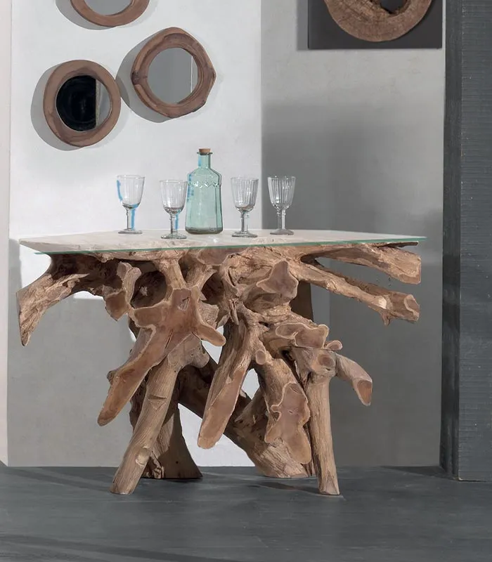 Console en racine de teck et plateau de verre de 8 mm.